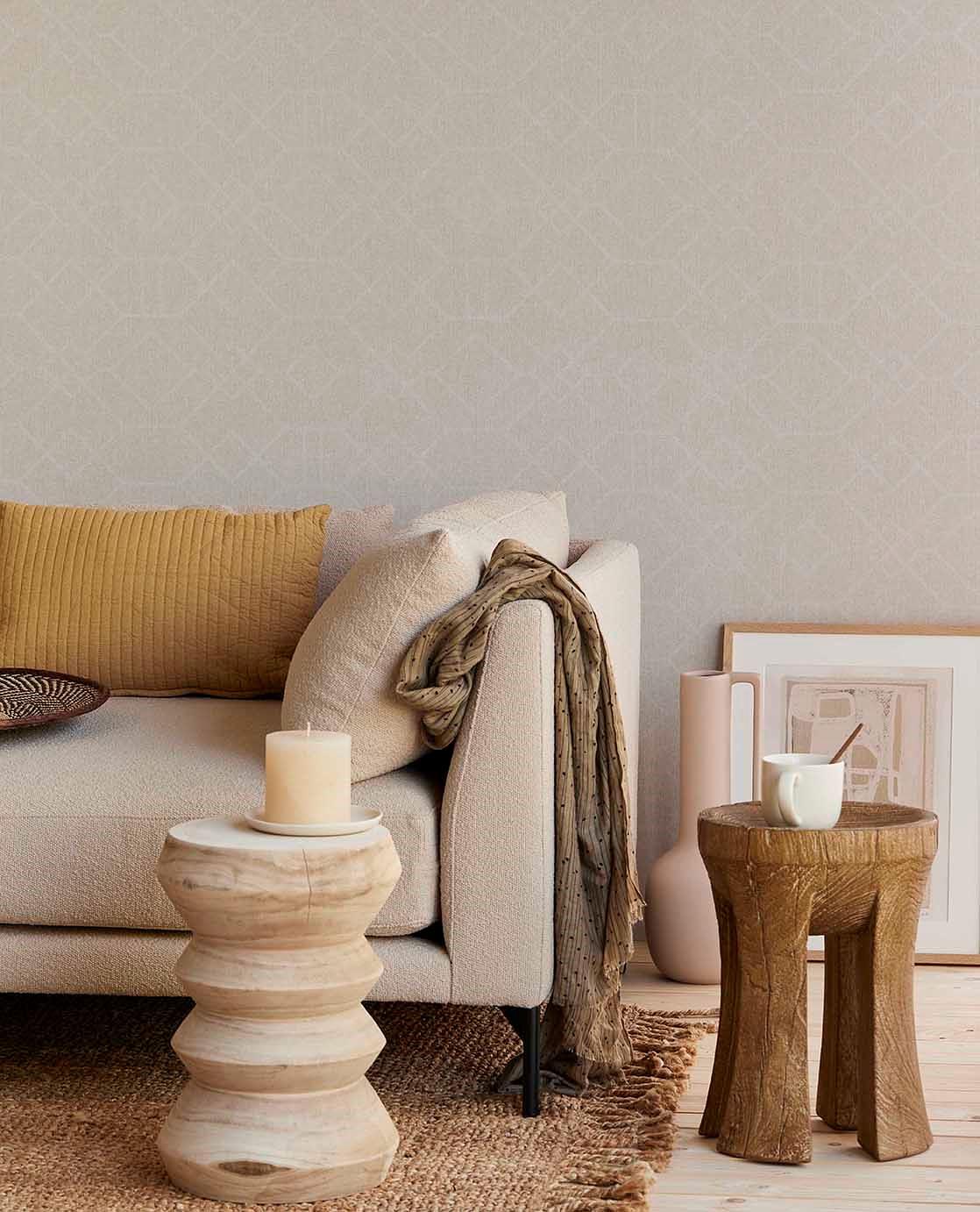 Har du en forkærlighed for berørbare teksturer? Delikate detaljer opdager du først, når du ser godt efter. Embrace er et fascinerende udtryk for naturlige materialer. Rigt sammenflettede teksturer, professionelt udformet til smukt tapet. Berørbare teksturer er hemmeligheden bag denne kollektion. Designene er sofistikerede og lagdelte. Nogle overdådige og dristige, andre sarte og beherskede. Lad fingrene følge trådene rytmisk sammenflettet i et organisk motiv. Drøm dig væk til sand krusninger skulptureret af havets bølger. Bliv inspireret af farverige prikker blandet i en fantasifuld mosaik eller nuancerede farvelag med frodighed fra keramiske glasurer. Du kan også vælge et raffineret bladmønster, der skinner blødt mod en mat baggrund. Eller den subtile grafiske vævning, der minder om et gobelin. Varme neutrale farver, rødmende jordfarver, tåget grågrøn og intim okker beriger dit interiør. Omgiv dig selv med varme og nyd den bløde berøring af Embrace hver dag.